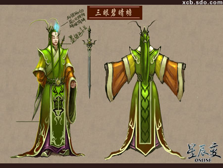 三眼碧睛蟾(人形状态) 一绿衣男子,后背一把宝剑。那一头绿色的长发垂落于腰际,最诡异的是绿衣男子眉心有一道绿色竖线,仿佛是紧闭着的第三只眼睛。