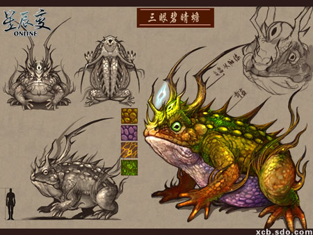 三眼碧睛蟾(神兽状态) 此神兽不知修炼了多少年,从外表看好像是一只巨大的蛤蟆蹲伏于地。额头中央的绿色眼睛闪动着奇特的光芒,凝聚着其一身的修为。