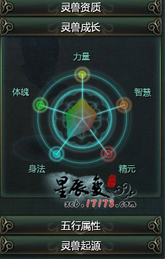 灵兽的基本属性包括:力量、身法、体魄、智慧和精元五项。每一项都分别和灵兽的一项能力成直接的关系。这些基础属性也决定了一个灵兽的基本能力强弱。