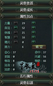 灵兽每次升级都会获得一点潜力值,由主人来自由分配到5个基本属性中去,一般灵兽宝宝的属性都会是野生灵兽的好几倍,所以当你抓到一个灵兽时一定要首先给它还童,这样才能促进它之后的健康成长。