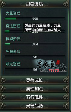 灵兽的养成属性包括性格、成长度、潜力值、资质、灵性、饱食度等等,每一项属性也都对灵兽的战斗和防御力,以及灵兽的发展前景有着直接的关系。