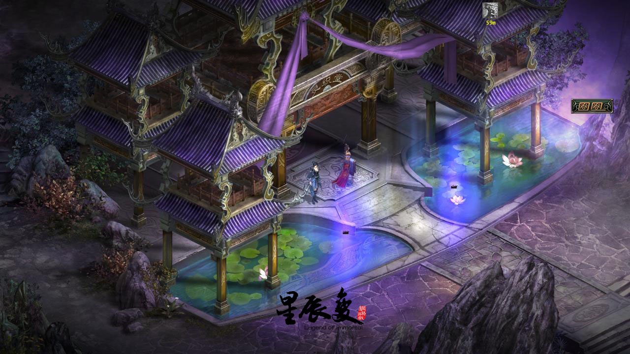 地图场景上, 《星辰变》大量使用了绿与紫两大色系元素。绿色透着祥和的仙趣,而紫色则更显瑰丽奇幻。基于传统中国韵味的建筑风景被色彩与想象力超现实化,构造出一个个世外桃园般如梦似幻的景色。此外,在2D游戏中引入了三层动态卷轴技术,人物和景致互动,场景和场景互动,让整个画面更加飘逸鲜活。