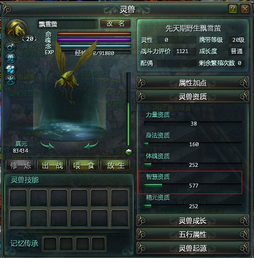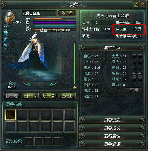 灵兽成长度:成长度也就意味着成长时候的潜力,共分为普通、优秀、杰出、卓越和完美五个阶段。如果你的宝宝能达到完美,升级后每一个技能点提升的幅度就会高很多。形象点说,同样属性的宝宝,完美宝宝升一级提升的战斗力可能普通宝宝需要升十级哦。鉴定成长度可以找灵兽饲养师。