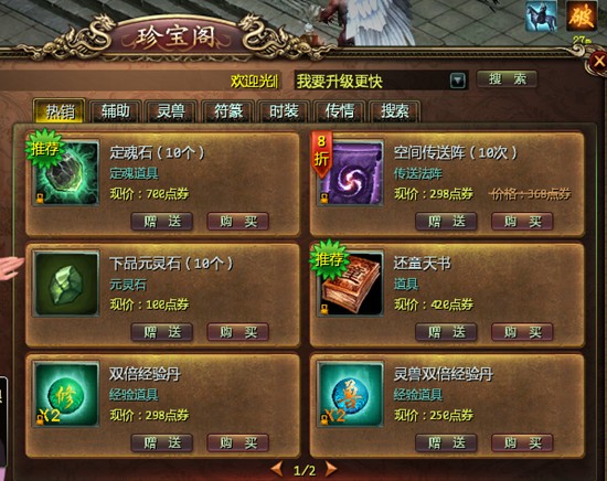 通过界面的下方“宝”可以去珍宝阁去看更多珍品和道具