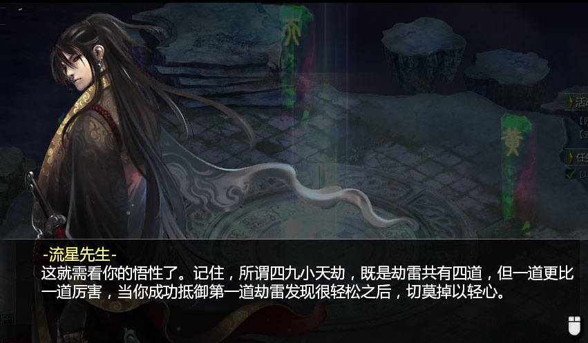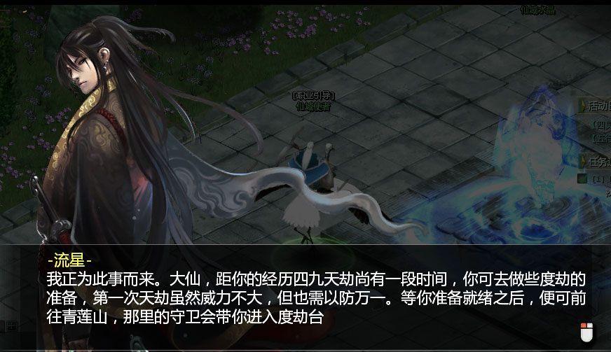 当角色在游戏中等级达到20级的时候,不管你愿意不愿意,都会被NPC传送到青莲山脉渡劫台去渡过游戏中人生的第一次雷劫——四九小天劫。而渡劫台上天无路,入地无门,进去以后是怎样都没办法囫囵着出来的,所以达到20级时必须先做好渡劫的准备。