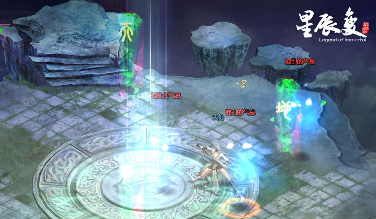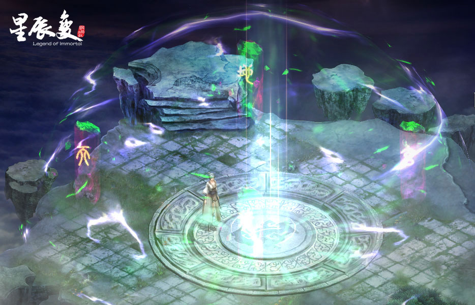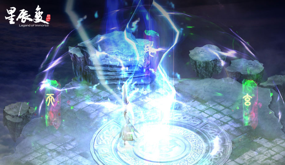 注意看渡劫台四周,有四根悬浮的晶体柱子,上书“天地玄黄”四字,按照顺序开启四个晶体,便可以触发“反八卦之势“了。但是每到劫雷过后,保护罩便会消失,而晶体的位置也会发生变化,要趁着下道劫雷来临之前迅速再度开启之。