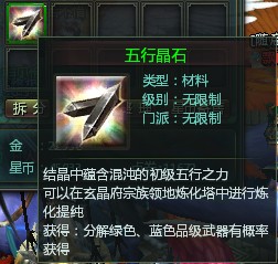 分解装备和首饰有机会获得金木水火土五种晶石,而分解武器就有机会获得五行晶石。五行晶石除了可以锻造武器之外,还是每日五行任务的必须品,市场价格也是不菲的哦。