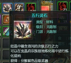 如果说五行晶石是打造一般武器的材料,那么五行灵石就是打造高端武器的材料,因此,五行灵石一般比较难得。分解紫色武器就能得到,不过分解其他的绿色的武器装备也有可能,但是几率比较小就是了。一般舍得分解紫色武器的人,好像还不多。