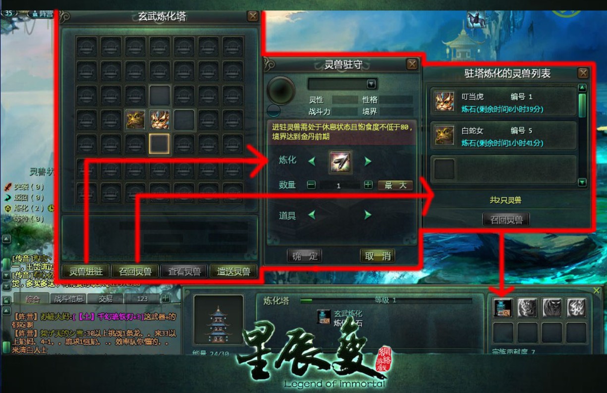 炼化塔:能将五行晶石炼化为宗族对应的晶石!小编的宗族属于水属性!将五行晶石晶石炼化为水晶石!!小编的灵兽金丹期,最多能炼化3个五行晶石!炼化1个五行晶石需要1小时,1个五行晶石能炼化3个属性晶石!每位玩家一次只能3只灵兽进驻炼化塔,当有灵兽炼化完成,而玩家没有召回,族长能将灵兽送回玩家背包,晶石将纳入宗族仓库!