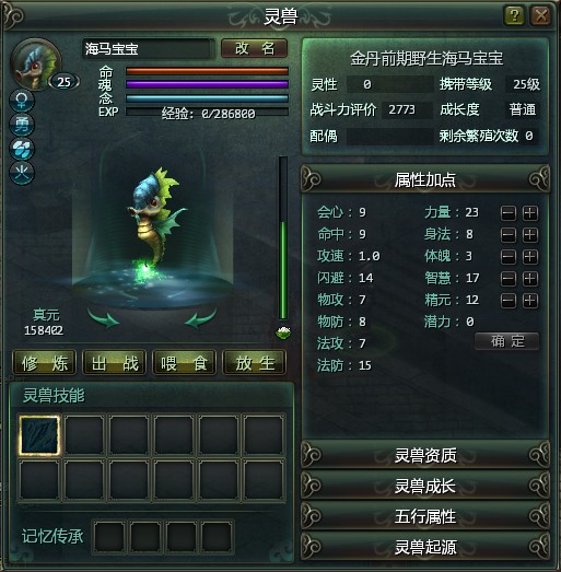 以上两只海马宝宝灵兽,一只是勇敢的性格、五行属性为火、拥有寒冰诀技能,一个是冷静的性格、五行属性为火、拥有剑气术技能,那一只的技能更适合其自身的性格呢?不同的性格,不同的五行属性,你知道如何分配属性点才更适合自身的职业吗?