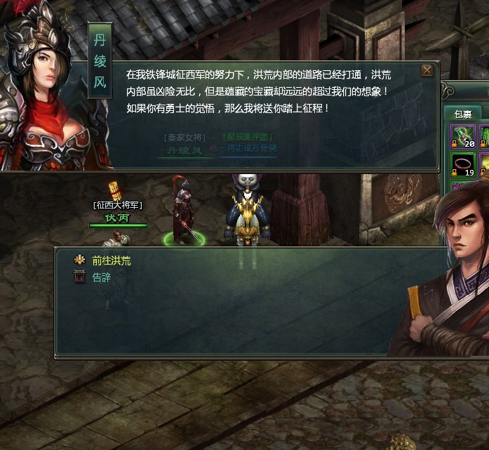 洪荒的入口在边境驻地找NPC丹绫风传送,进去前可得先把包里的东西清一下,把不绑定的贵重物品存放在仓库,在里面死亡也是会掉包裹里的东西的哦,大家可得小心点。里面是不能组队的也不能交易,如果你在外面组好队在进的话,进入洪荒后也会自动****。