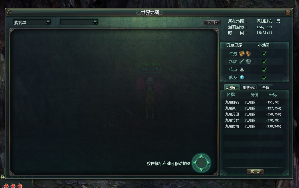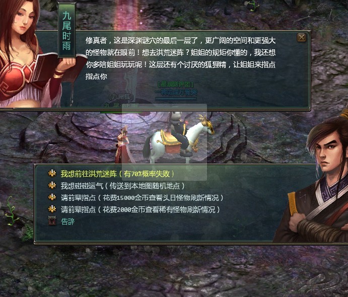 在里面除了洪荒能看到地图外,其他3个都是看不到地图的,只有一个简单的坐标,要靠自己慢慢摸索。迷失森林和深渊迷穴一层可从洪荒传送使花点钱直接传送,也可打开地图自动寻路去(比较危险哦)。洪荒迷阵只能在深渊迷穴三层传送使传送才能到达。这几个地图都有4-6名传送使可以让你传送到下一层或是传送到本地图的随机位置(说不定就刚好把你传送到头目身边哦^_^)也可以花点钱询问本地图的稀有怪或头目刷新了没有。传送到下一层的时候是有几率失败的,一层传二层失败率是30%,二层传三层是50%,三层传送到洪荒迷阵是70%,如果失败则会被传送到本地图的随机位置,另外洪荒迷阵能往回传送到三层其他则不行。告诉大家个小窍门,要找传送使的时候点N就能看到传送使的坐标了,可根据自己当前的坐标对比下各传送使的坐标,哪个最近点下自动寻路就OK了。