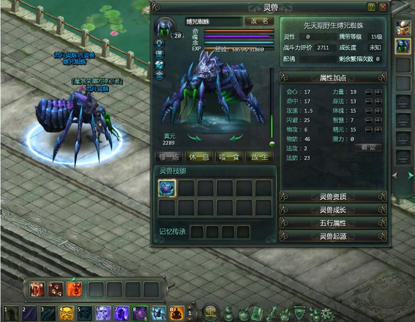 基础属性:显示灵兽基础属性。灵兽外观:显示灵兽外观样貌。灵兽操作按钮: 修炼--进入修炼状态; 出战--放出灵兽,协助战斗; 喂食--增加灵兽饱食度; 放生--善心大发,把灵兽放生,作为对善心人的支持,会给予玩家大量的真元作为奖励。灵兽技能:显示零食已经学会的技能。零售改名:点击更改灵兽的名字。灵兽栏:可携带灵兽的空间,随着玩家境界的提升,灵兽栏的数量会增加。灵兽属性:显示灵兽的详细属性。
